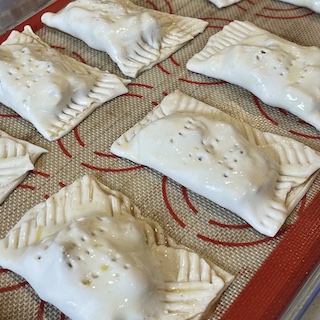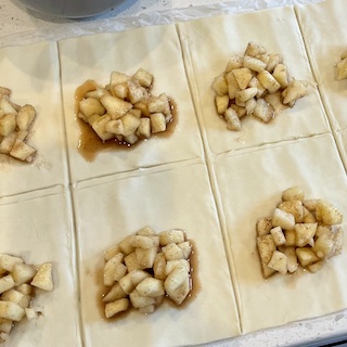 Assemble the Puff Pastry. Roll out puff pastry sheets. Cut into squares or rectangles. Spoon apple filling into the center of each piece. Fold over and seal edges with a fork.